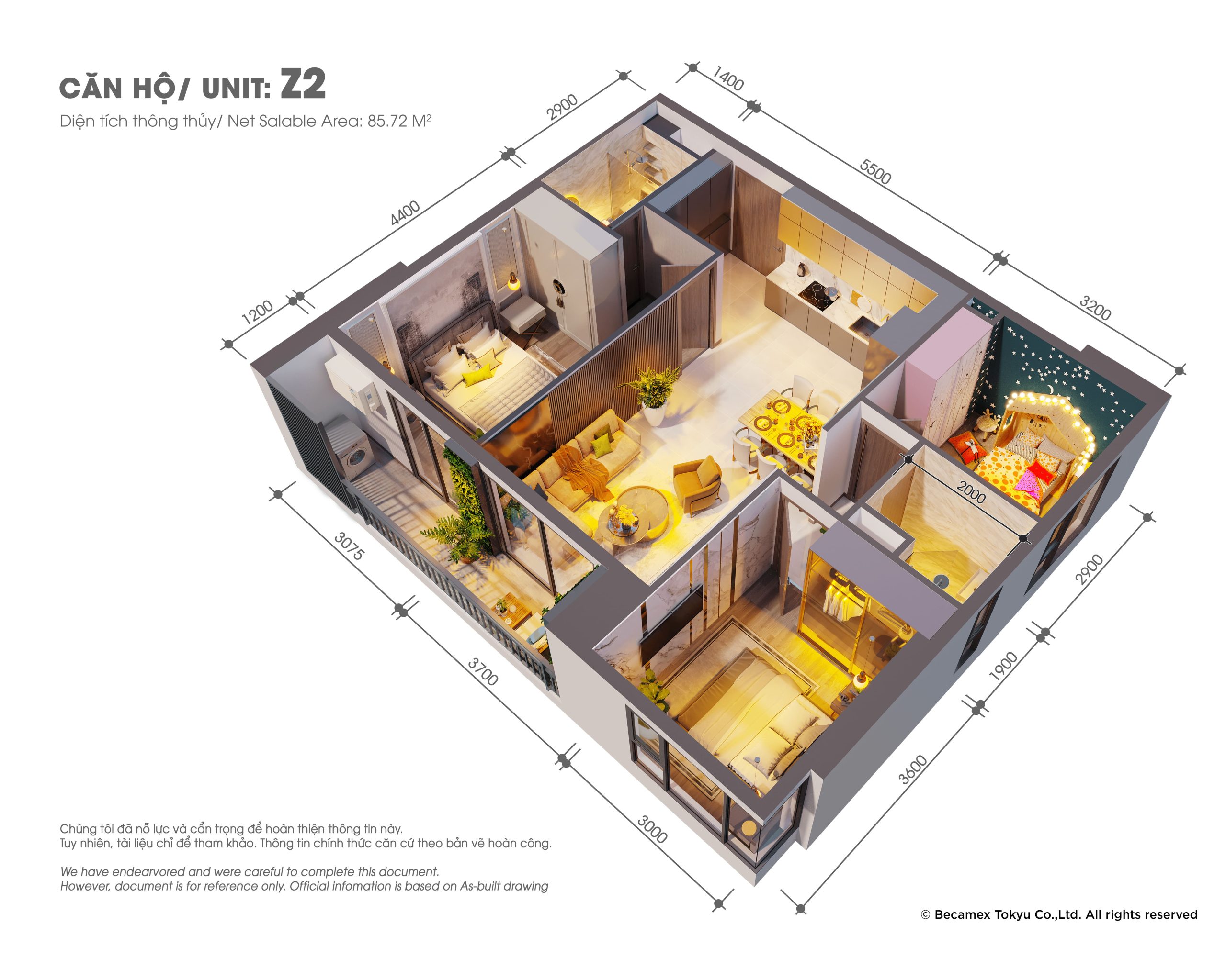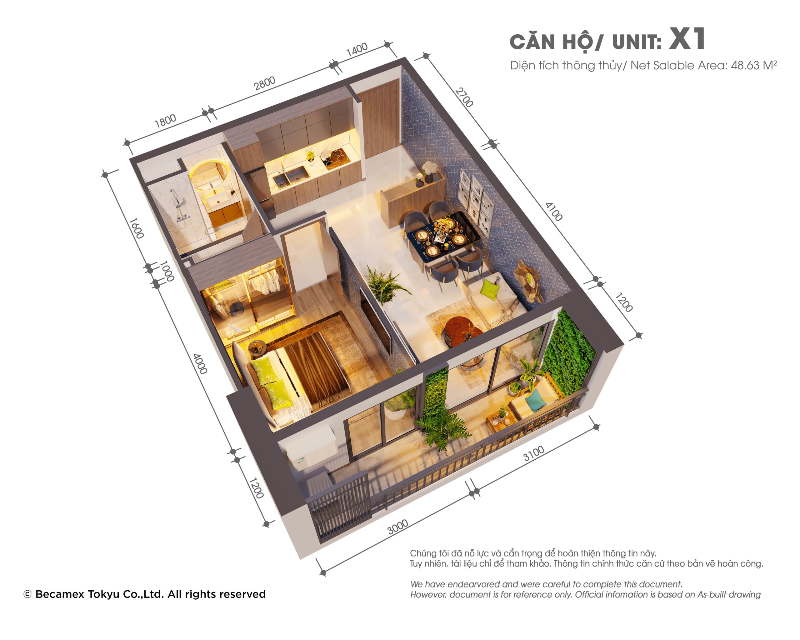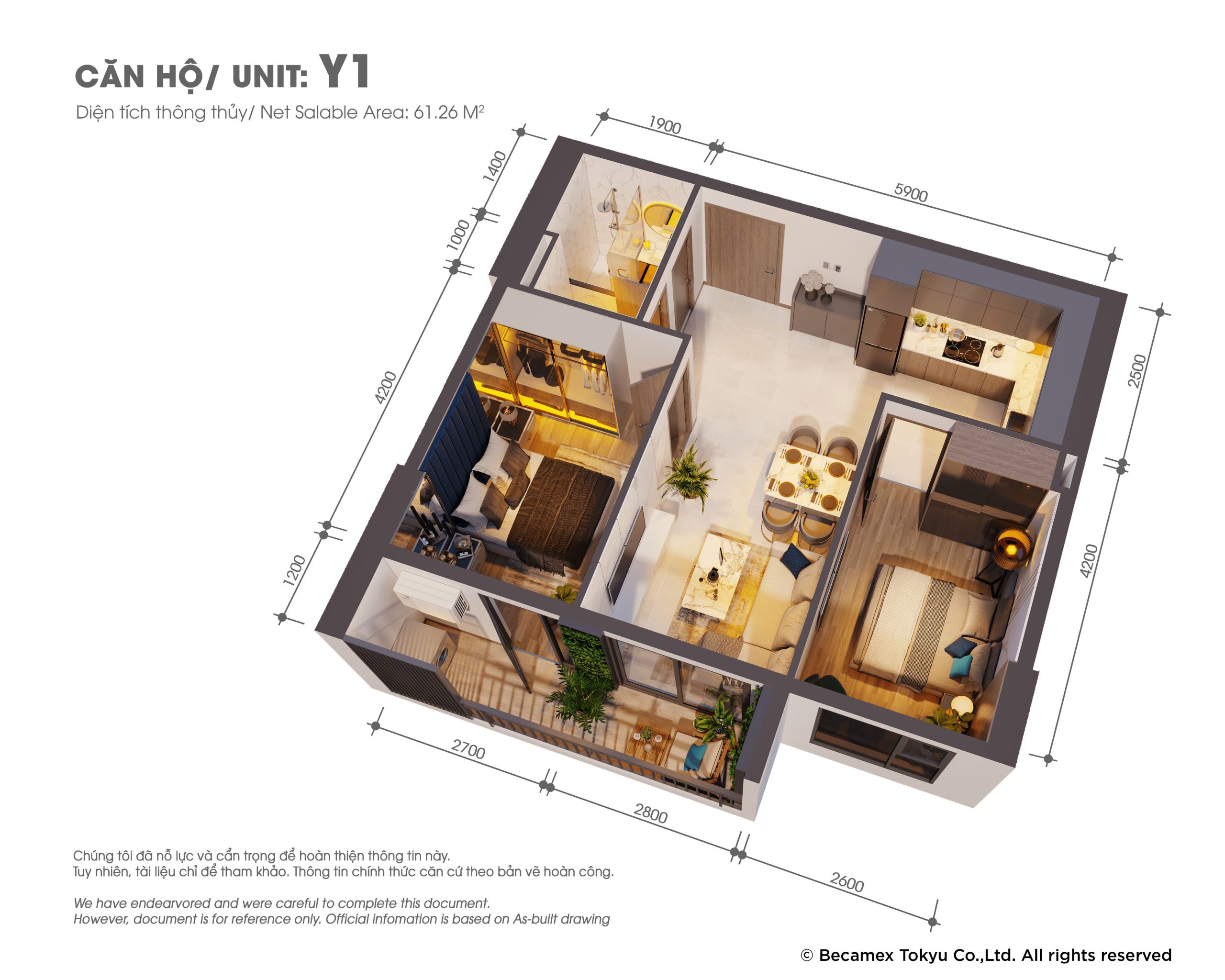 • Diện tích căn: 48.03 m² – 107.72 m² từ 1 PN đến 3 PN